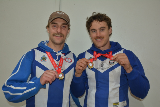 Victor Harbor stars Zac Dowling and Jackson Elmes with their A grade premiership medals.