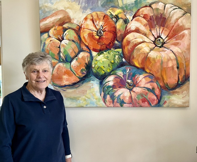 Roe Gartelmann with her painting (since sold) 'Heirloom Collection'.