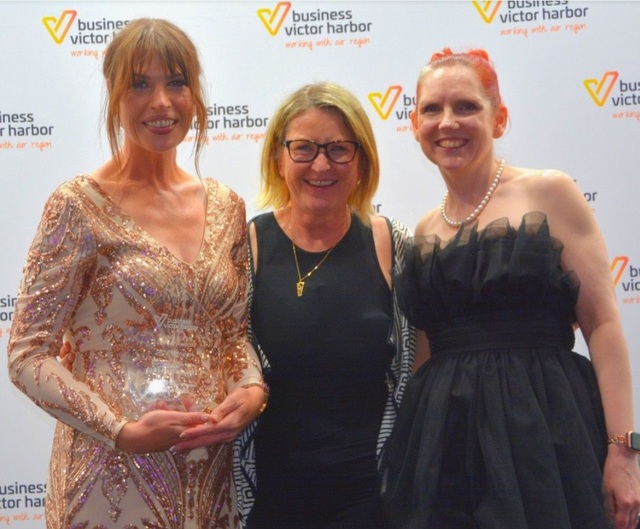 Taryn Lattanzio won the top award in 2023 and is with City of Victor Harbor Mayor Moira Jenkins and Natalie Stevenson from Community Bank Fleurieu, Bendigo Bank, the major sponsor of the 2025 Excellence in Business Awards.