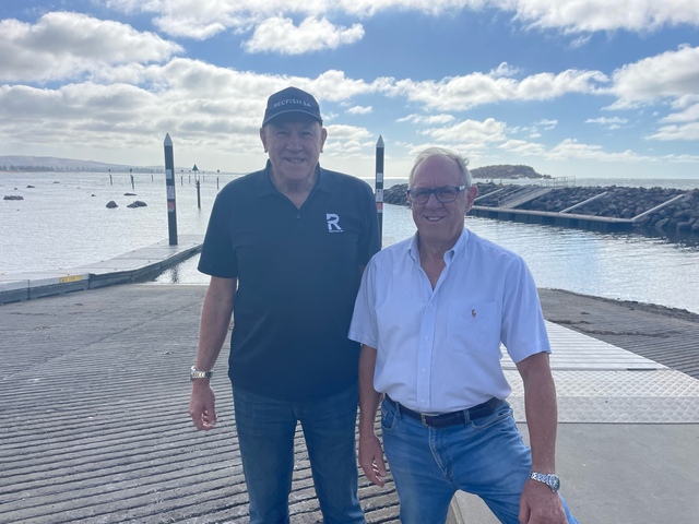 RecFish Deputy Chair Barry Brown at The Bluff Boat Ramp with local boatie Brian Hockney. (Michael Simmons 514355_01).