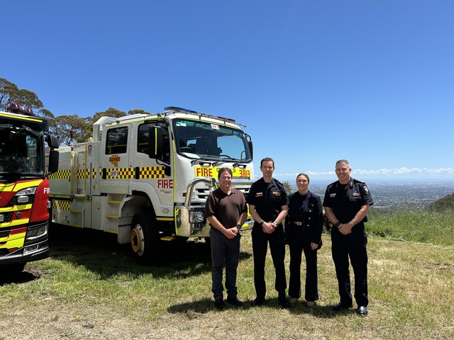 Ian Hancock, who was impacted by the Sampson Flat fire, CFS statewide operations executive director Brenton Hastie, Emergency Services Minister Rhiannon Pearce, and MFS Chief Officer Jeff Swann urge everyone to prepare for fire season. (CFS Media)