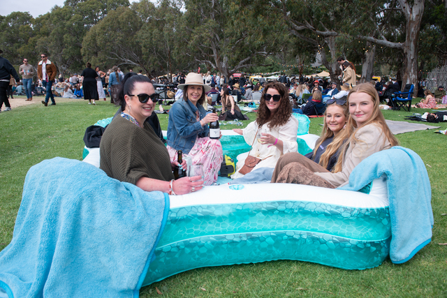 Melissa Hartwell, Mandy Jackson, and Felicity Hartwell, of Strathalbyn, Ella-Rose Evans, of Victor Harbor, and Keely Hutchinson, of Strathalbyn, used a blow-up pool instead of the usual deck chairs and picnic rugs. (Dani Brown: 516310_16)