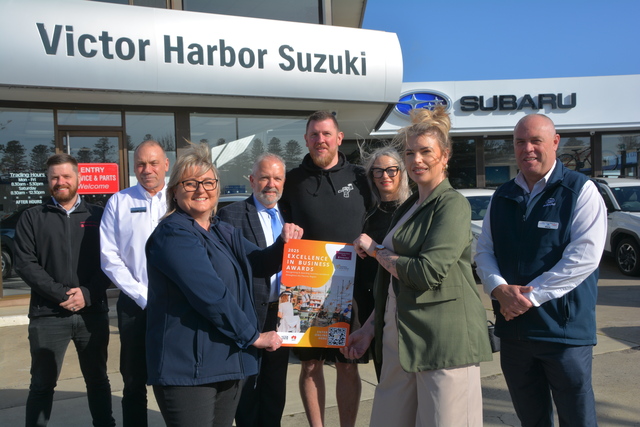 At the front holding the poster promoting the Business Victor Harbor Excellence in Business Awards are past winners Leanne Farr (BCS Electrical) and Taryn Lattanzio (jaDs). At the back are Tom Haywood and Rob Kidman (Community Bank Fleurieu), Colin Shearing (BVH), Barry Dewson (Chop It Axe Throwing and Escape It Rooms), Sarah MacMahon (BVH) and Steve Chapman (Victor Harbor Motor Company).