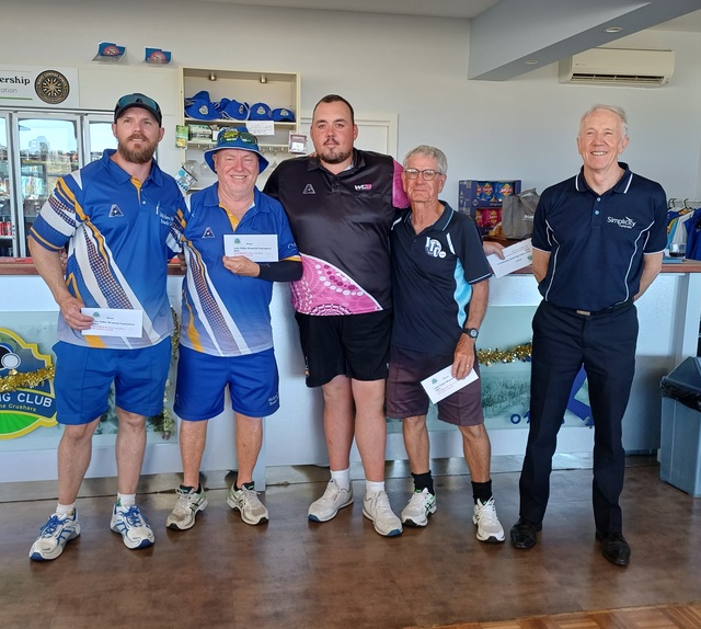 Overall tournament winners were Leigh Brennan and Ray 'Ninja' Dienelt (McLaren Vale Bowling Club), former Scottish International player Chris Carswell and David Bryant (m Port Noarlunga Bowling Club) with Simplicity Funerals' Duncan Ferguson. (Supplied)