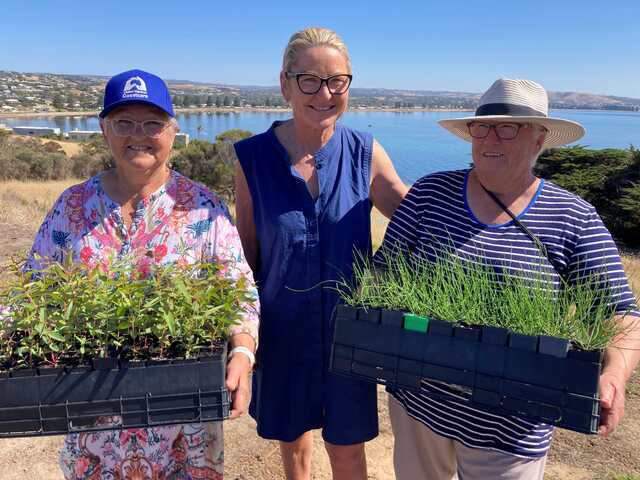 At The Bluff with seedlings ready to plant are Biodiversity Victor Harbor's Loreto Cameron and Ann Wright with Mayor Moira Jenkins (centre).