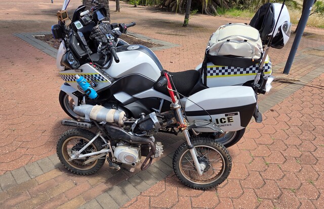 The homemade pit motorbike in front of the police motorbike. (SA Police)
