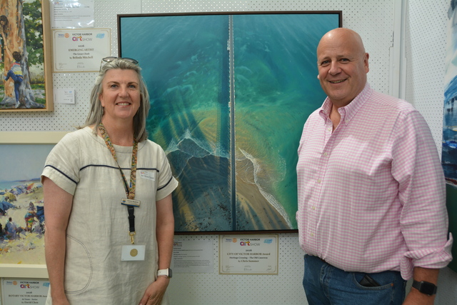 City of Victor Harbor CEO Victoria MacKirdy and Member for Finniss David Basham next to the painting of the old causeway. 527905_02