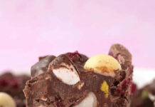 Ingredients: Chocolate melts, marshmallows, raw cashews, glace cherries, sultanas/dried apricots, spearmint lolly leaves.
