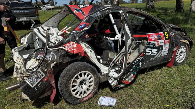 Toby Price and Holly Kilbride's car following the crash, which saw them retire from the Adelaide Hills Rally. (Australian Rally Championship)