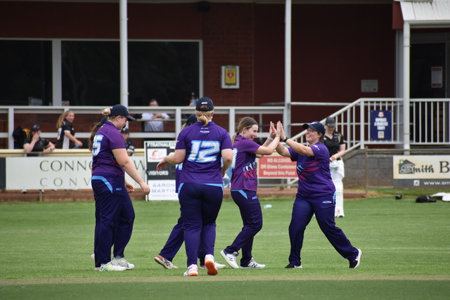 The Eastern Falcons celebrate taking a wicket during round one of the 2025-26 season. (Chloe Hull)